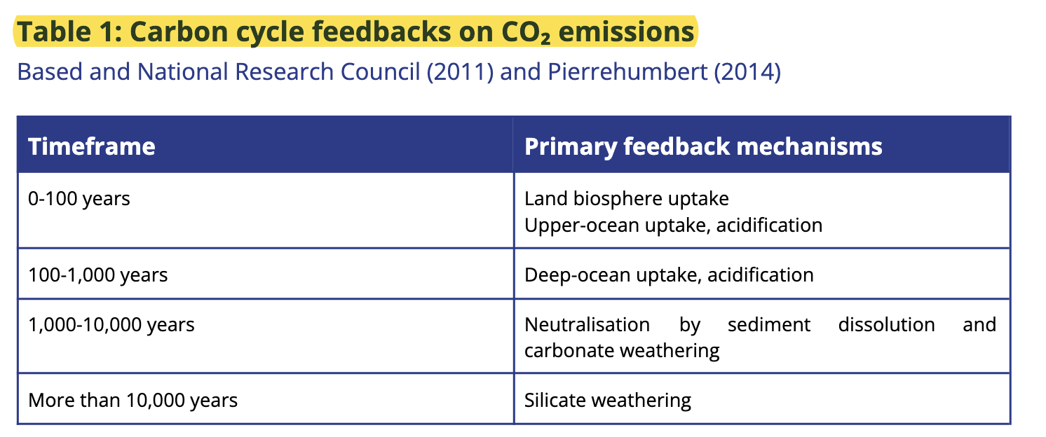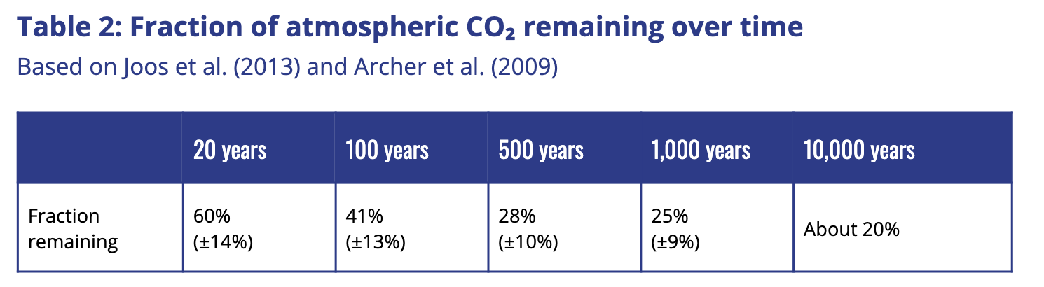 まず抑えるべきはカーボンサイクルの時間軸です。以下の通り、大気中に放出された炭素循環は非常に長い時間軸の中で大気、陸域、海域と移動します。初期濃度の大部分は、数十年から数世紀かけて生物圏と海洋に取り込まれ、最初の減少は急激で、最初の排出から数年から数十年の間に大きく取り込まれます。その後、海洋と大気が平衡化するにつれて、数世紀から数千年の間にプラトーになります。