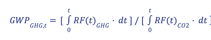 少し脱線しますが、ここでおそらく皆さんにも馴染みのあるGWPの話をします。メタンは 二酸化炭素に比べて、温室効果が30倍にも上り、それに応じてCO2(e: equivalence)と二酸化炭素換算の値が使われていることはご存知かと思います。基本的な考え方としては、放射強制力の積算値(cumulative radiative forcing)について二酸化炭素との相対的な値を計算しており、以下のような数式により計算されます。