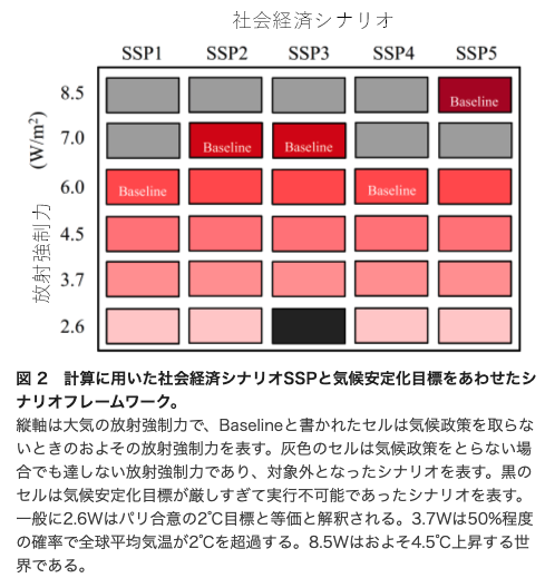 上記のSSPと放射強制力のシナリオフレームワークにおいて、SSP1-1.9およびSSP2-4.5の2つに対して検証されています。それぞれのシナリオの概要は以下の通りです。