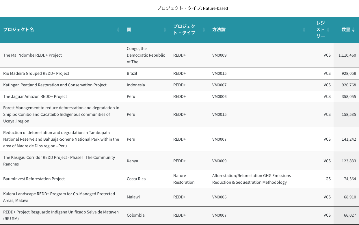 本対象期間に最も多く償却されたトップ10の自然由来プロジェクトの一覧は以下の通りです。