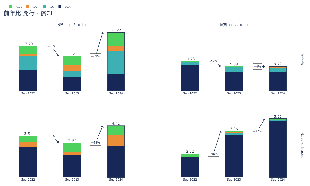 発行・償却の動向としては、引き続き、クレジットの償却はVCSが大半を占めているものの、発行としてはVCS以外のGS、CAR、ACRの割合が増えている傾向が観察されます。