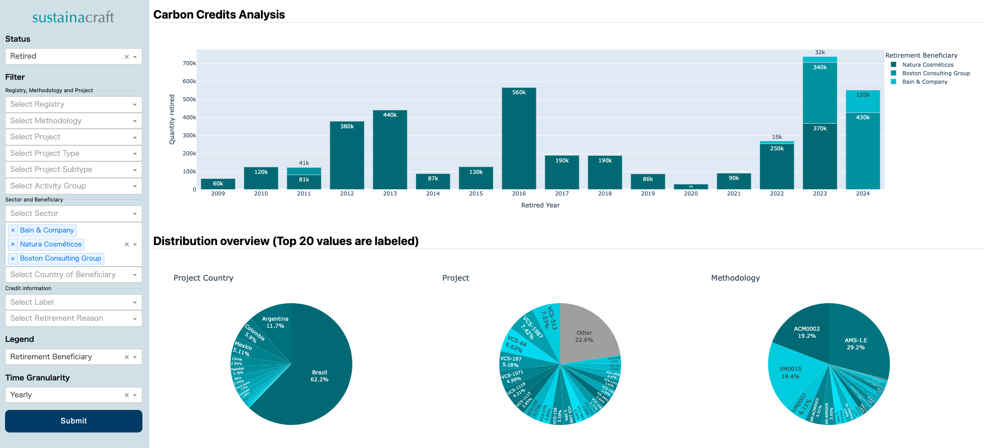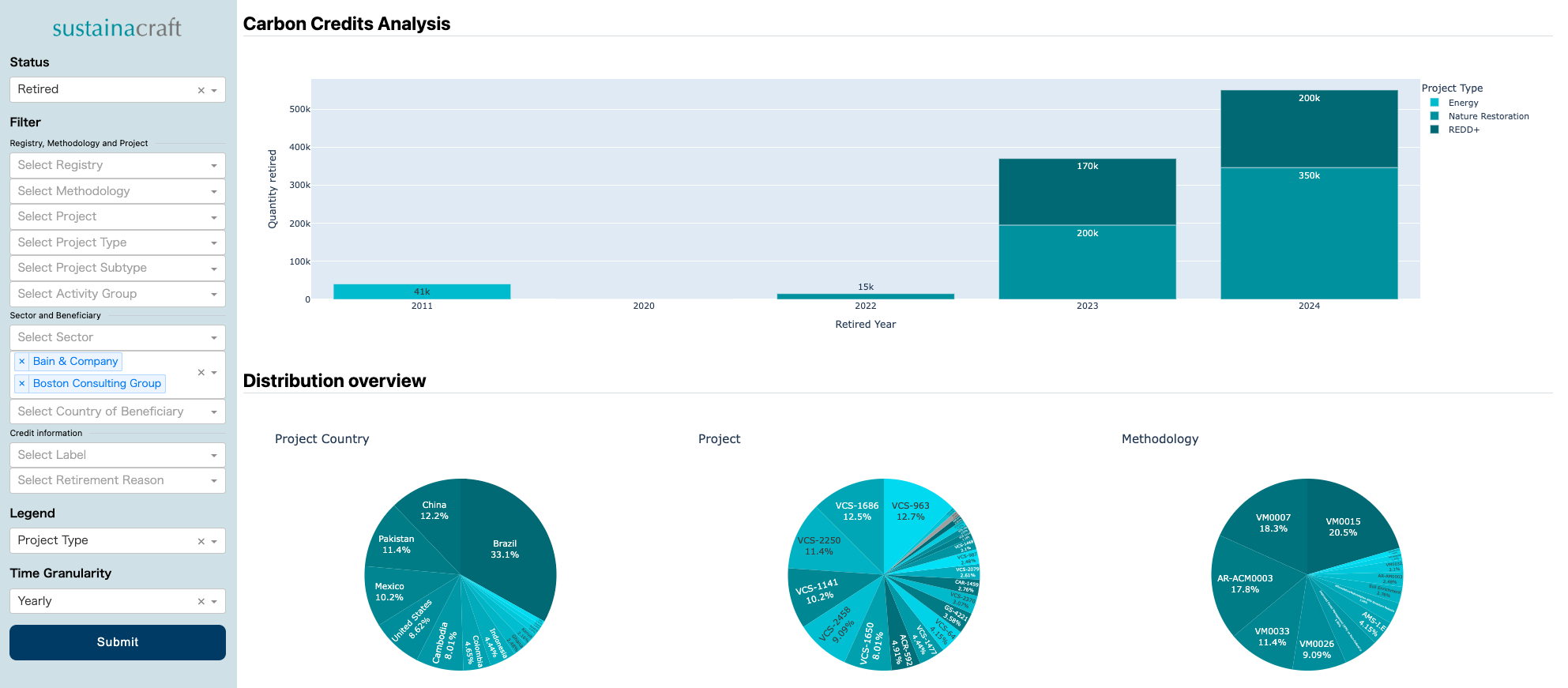 この3社によるクレジット償却実績は以下のとおりで、大半がVCSのクレジットが使われています。特にコンサルティング会社2社による償却は、大半が自然由来の案件で、かつ植林系など高単価帯の除去クレジットと分類されるものを多く利用していることがわかります。