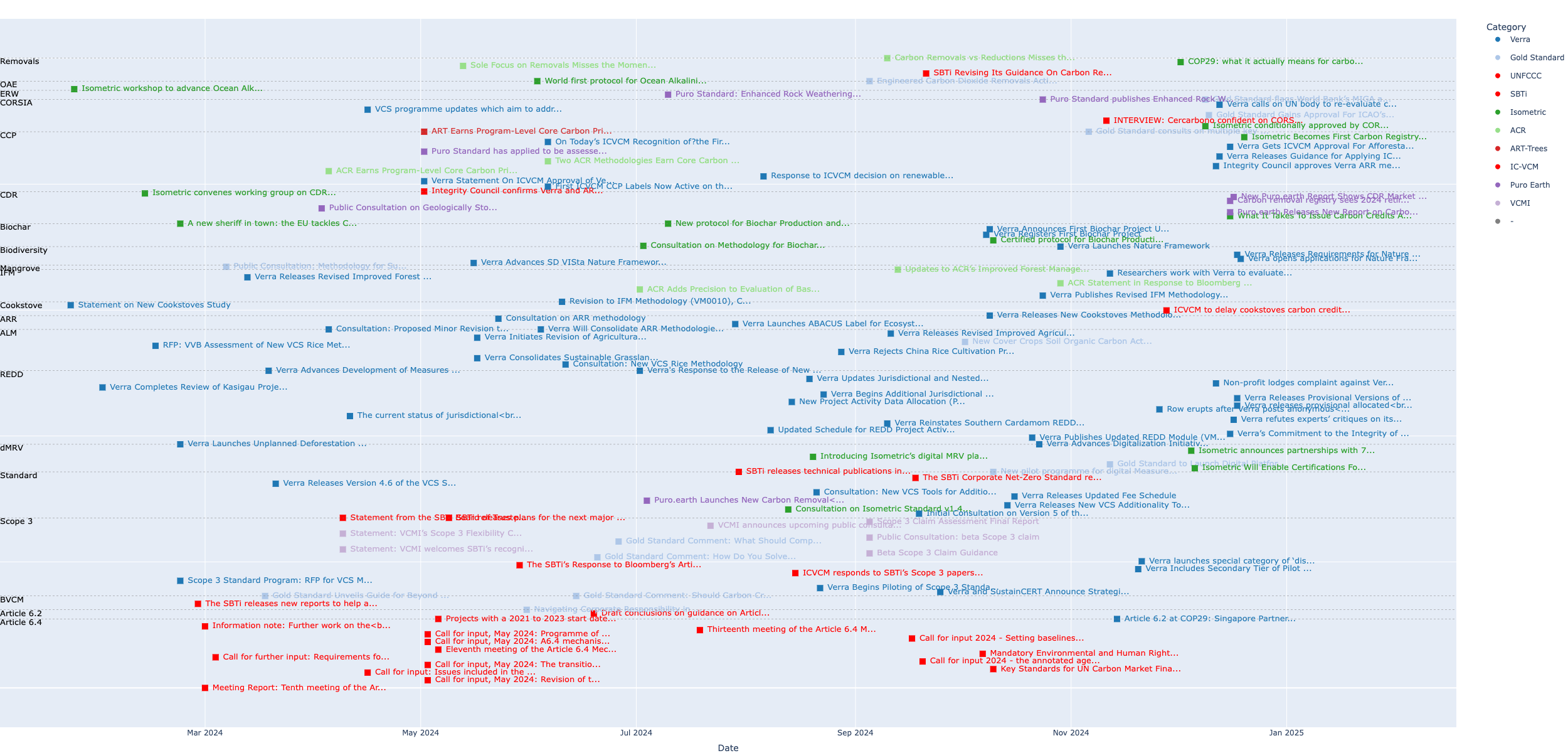 以下、UNFCCCやボランタリーカーボンスタンダード(Verra、Gold Standard、ACR、CARなど)やIC-VCM、SBTi、VCMIなどから発表された内容を表示しています。横軸には日付、縦軸にはトピックを並べており、2024年に発表された主要なものを表示しています。