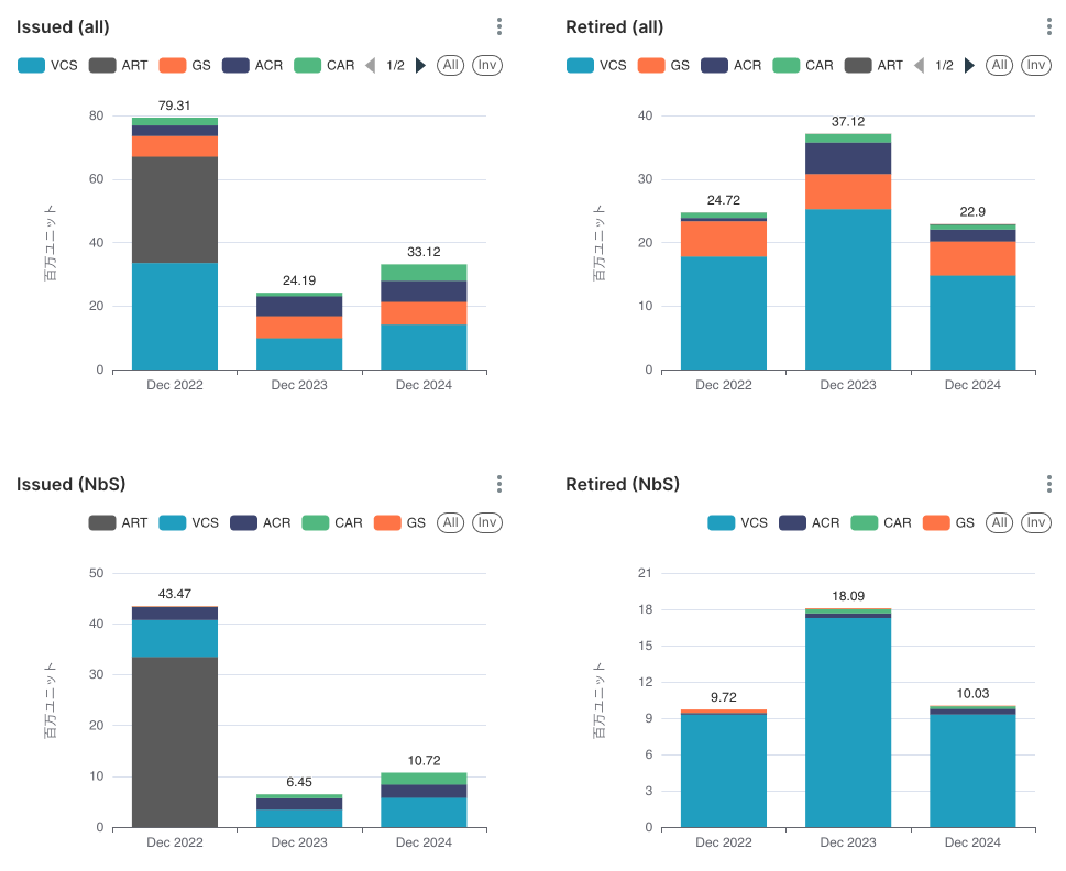 - 分析対象レジストリー: VCS(Verra)、GS(Gold Standard)、CAR(Climate Action Reserve)、ACR(American Carbon Registry)、Puro (Puro.earth), Isometric