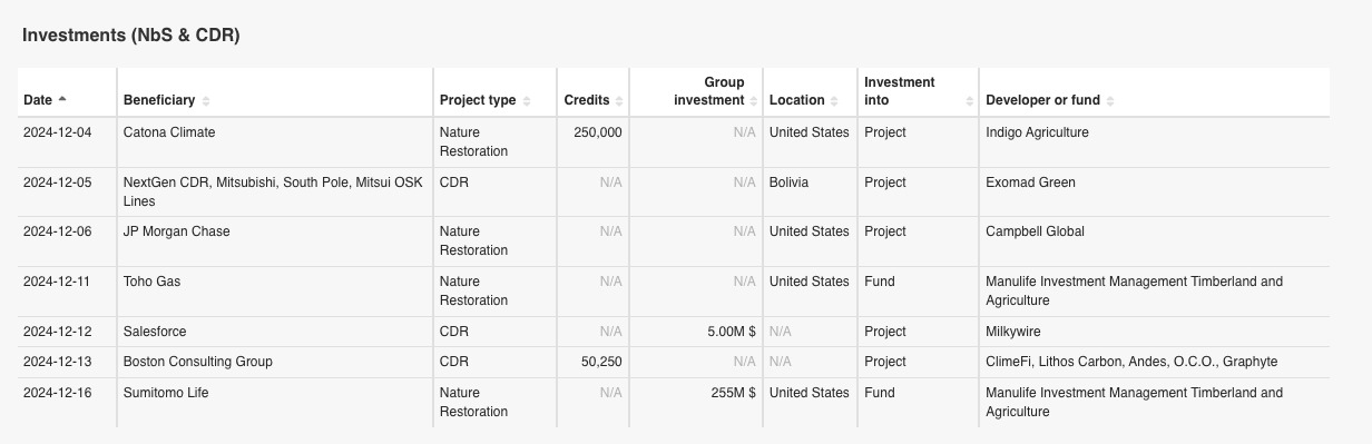 - 留意事項: 自然再生やREDD+、及び、自然由来系のCDR案件に対する投資を取り上げています。また、「クレジット量」や「投資額」については、今後の想定値である場合があります。12月には、自然由来のプロジェクトへの重要な投資が9件ありました。