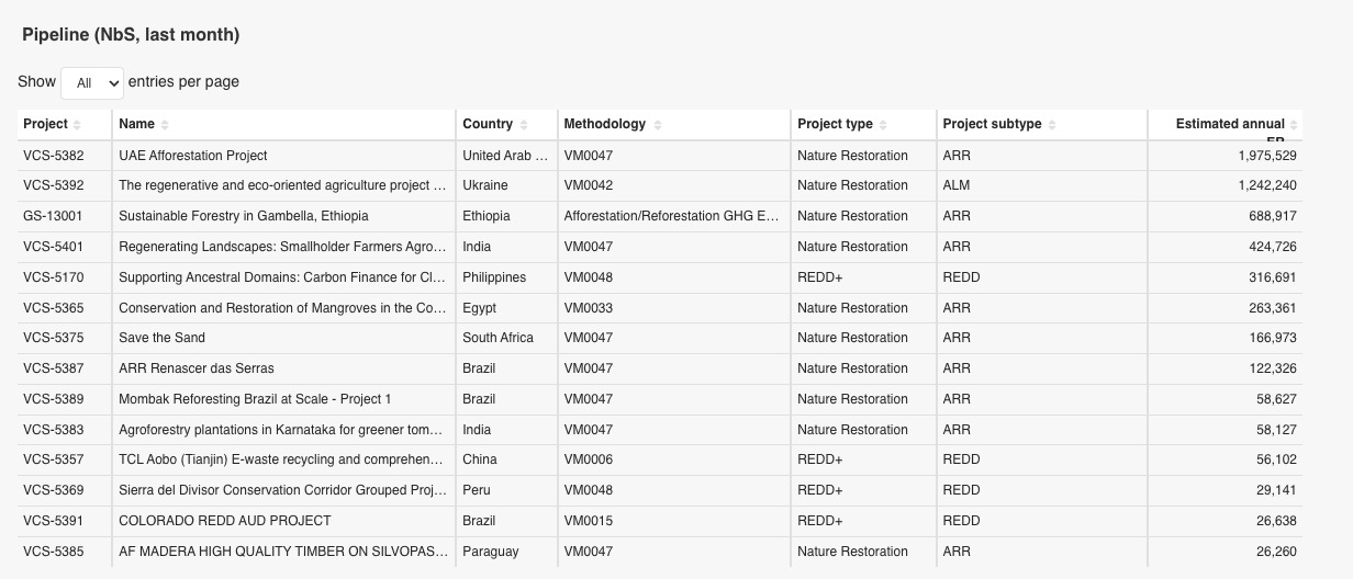 新規の案件パイプラインについては、毎月お伝えしている通りVM0047やVM0042といった、植林・再植林や再生農法の方法論を用いた案件が多く申請されています。今まではあまりARR案件が組成されていなかった、中東のUAEのような場所での案件も申請されています。