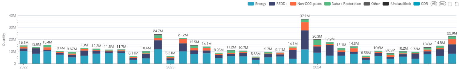 12月は毎年償却量が多くなる月ですが、2023年12月の数量ほどは償却されず、2024年1年間の償却量は163 M tCO2となり、年間合計の償却量は結果的に2023年とほぼ同等水準でした。年間を通したサマリーについては、前回のこちら記事をご参照ください。以下は月次の償却量を示しています。