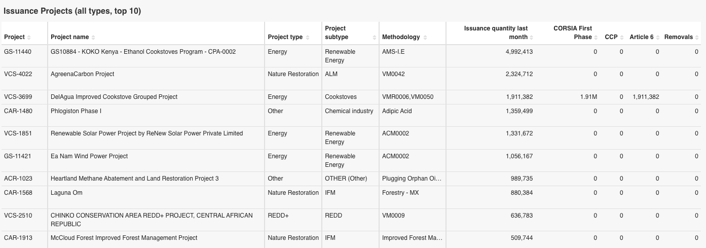 ・Article 6ラベルの情報を提供しているのは、VCSおよびGSのレジストリのみです。以下は、2025年9月にクレジットが発行されたプロジェクトの上位10件と、ラベル(Article 6、CCP、CORSIA、Removal)が発行された案件リストです。