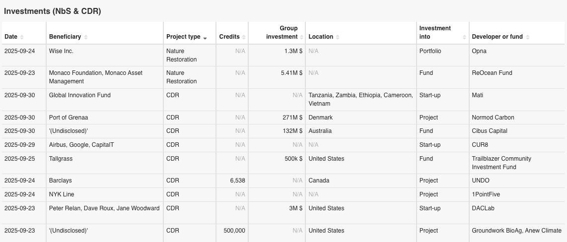 - 留意事項: 「クレジット量(Credits)」や「投資額(Group investment)」については、発表された数字のみを記録しているため、空欄がある場合があります。また、この表でのBeneficiaryとは、投資をした企業やクレジットを購入する側の企業を指し、Investment intoとは、投資対象がプロジェクトなのかファンドなのかを示しています。9月には、自然由来とCDRのプロジェクトへの重要な投資が11件ありました。こちらの内容については、A-3: 詳細解説セクションをご覧ください。