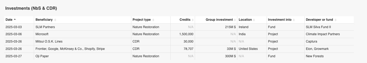 - 留意事項: 自然再生やREDD+、及び、自然由来系のCDR案件に対する投資を取り上げています。また、「クレジット量」や「投資額」については、今後の想定値である場合があります。3月には、自然由来とCDRのプロジェクトへの重要な投資が3件ありました。