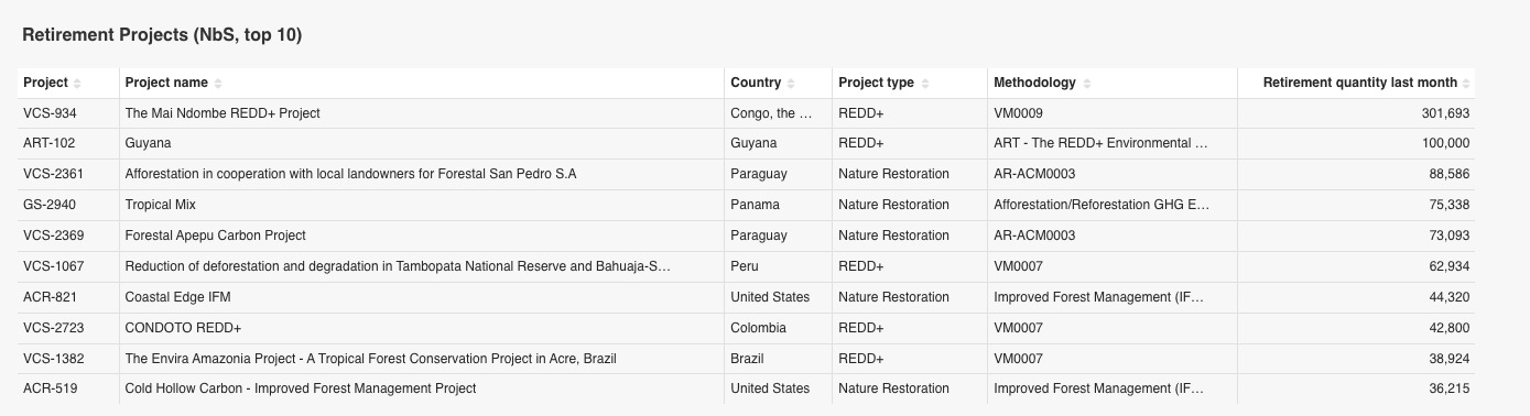 本対象期間に最も多く償却されたトップ10の自然由来プロジェクトの一覧は以下の通りです。