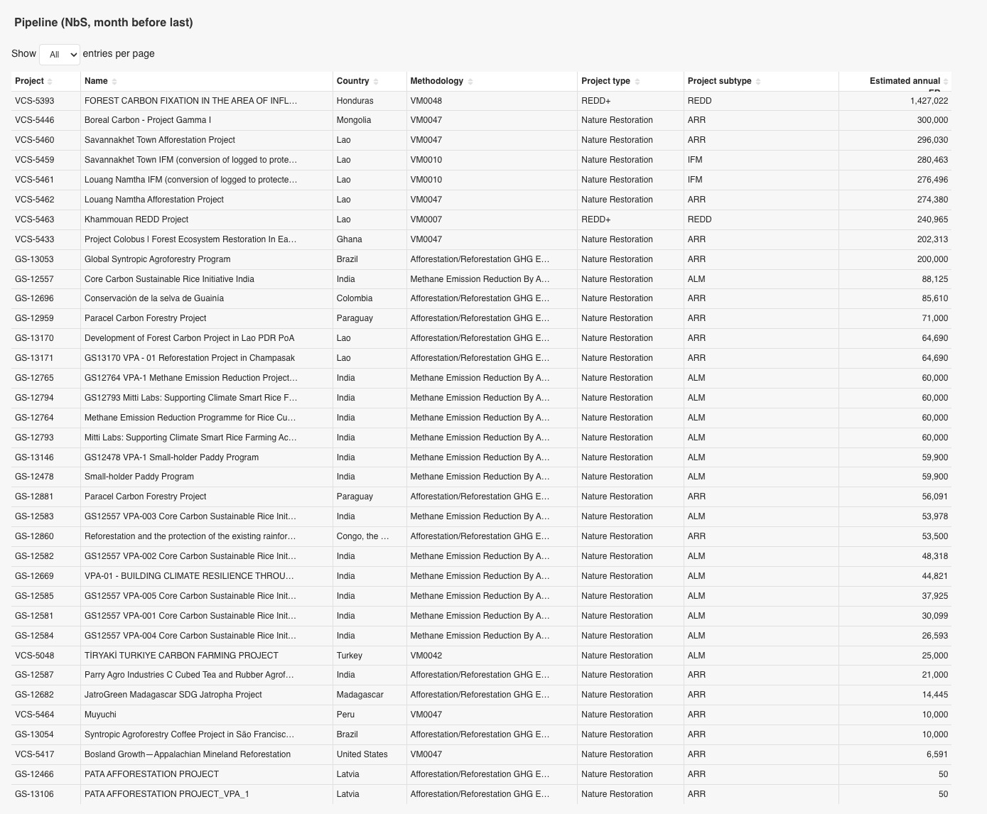 用語: 年間ERとは、年間の排出削減・吸収量(tCO₂e)のことを指します。このセクションでは、まず新しいパイプラインプロジェクトを紹介し、その後、前回のニュースレターに反映されていなかった先月のパイプラインでの重要な変更点をレビューします。