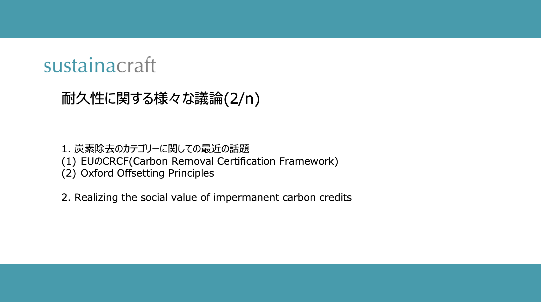 耐久性に関する議論の2回目でした。耐久性の議論はかなり難解なのですが、冒頭でも申し上げたとおり、企業が脱炭素を考える上で、もしくは外部で出てくる様々なガイドラインを解釈する上で欠かせないトピックと考えています。
