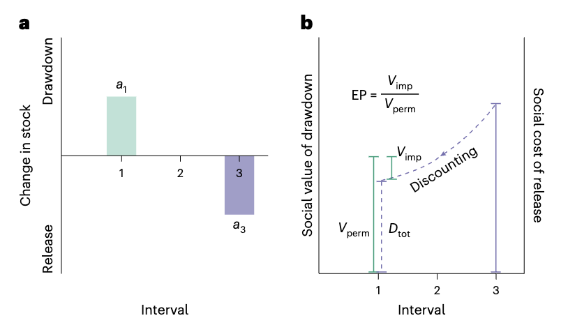 ここでは1トンCO2(e)の恒久的な炭素除去によるオフセットは、その時点でのSCCと(符号が逆向きの)等しい価値を持つことになり、これをV_permと下図では表されています。一方で、非恒久的なオフセットの場合、恒久的なSCCから、その後の炭素放出によって引き起こされる損害の現在のコストを差し引いたものであり、放出時のSCCから推定され、V_impと表記されています。前述のEP(equivalent permanence)は、このV_permとV_impの比率として定義されています。