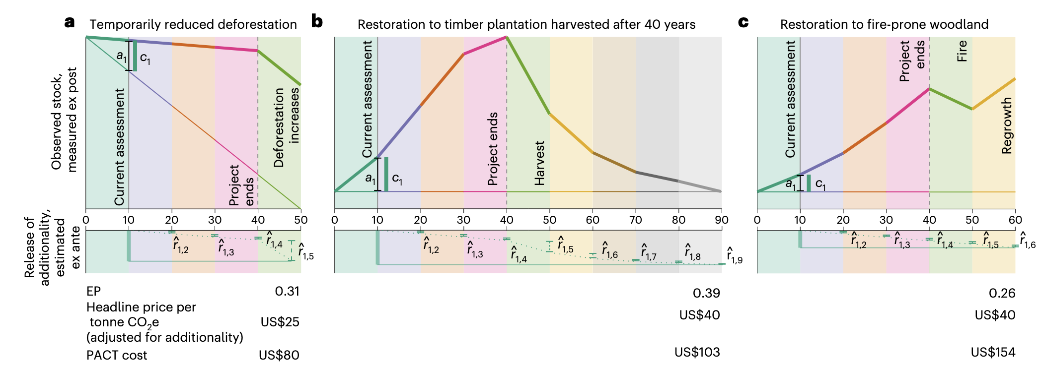 Here we attempt to address these substantial limitations by presenting a new dynamic accounting method for quantifying the long-run social benefits of impermanent NBS-derived carbon credits. Our Permanent Additional Carbon Tonne (PACT) framework allows credits to be issued and sold at the end of each time period, based on ex post determination of additionality and ex ante forecasting of reversals, and comprises three interlinked advances: