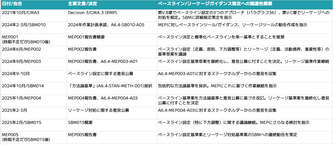 6条4項メカニズムにおけるベースライン設定とリーケージに関する方法論は、パリ協定の採択以降、段階的に具体化されてきました。