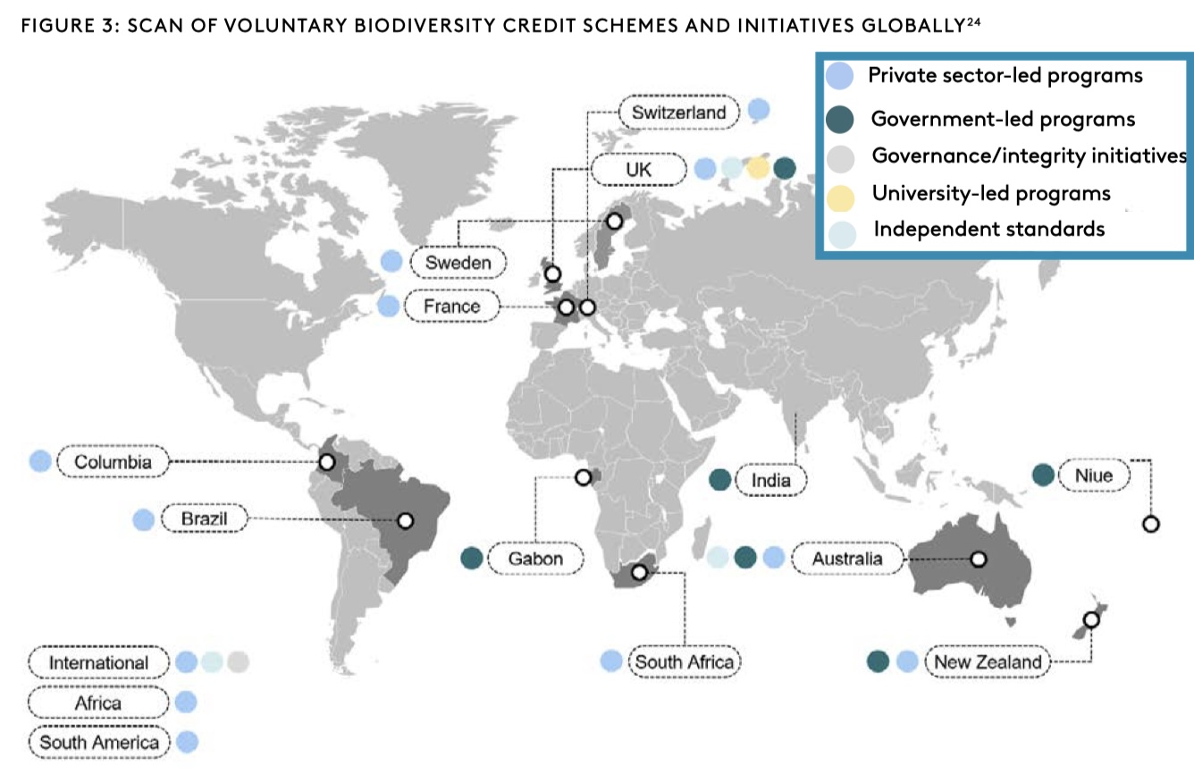 2020年以降、TNFD (Taskforce on Nature-Related Financial Disclosures)やSBTN (Science Based Targets Network)、Kunming-Montreal Post-2020 Global Biodiversity Frameworkといった国際的な標準が整備されてきたことを受けて、生物多様性クレジットのスキームを開発するイニシアティブが数多く立ち上がっています (下図参照)。