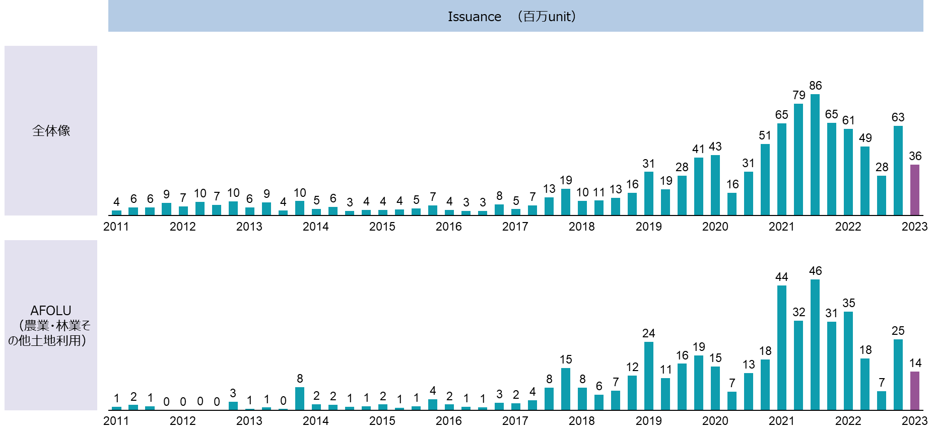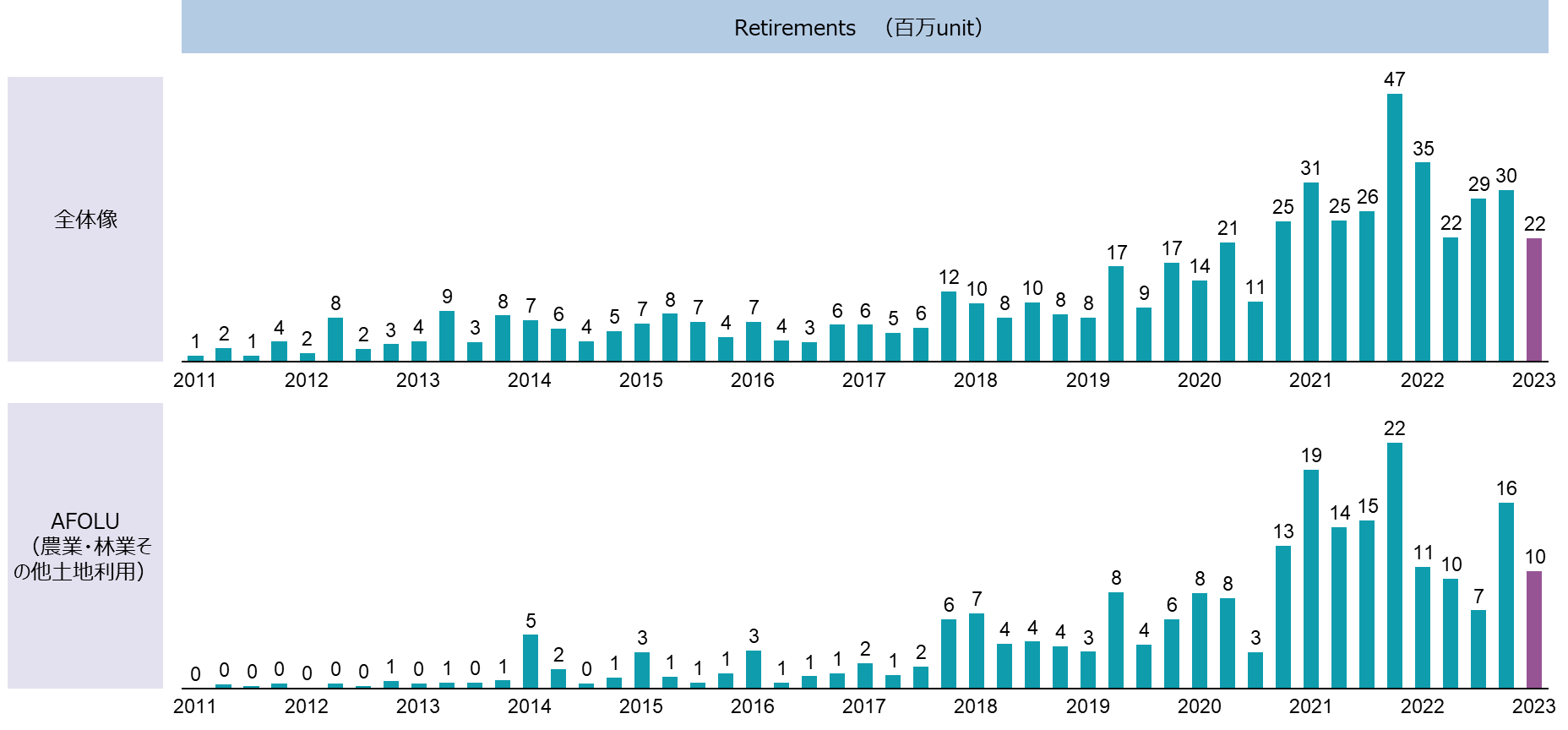 AFOLU(Agriculture Forestry and Other Land Use)セクターに限ると5,318,671ユニットが発行され、7,414,752ユニットがリタイアされています。それぞれ前年同月比+92%、+47%とより高い成長率を示しています。
