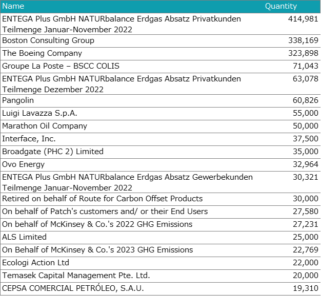 2023年5月にリタイアされたプロジェクトの一覧(AFOLUセクターのみ)です。上位20件のプロジェクトでリタイアメント全体の8割を占めています。国別ではBrazilが最大(46%)で、その後をIndonesia(10%)、Peru(10%)、Cambodia(9%)、Uruguay(4%)が続いています。